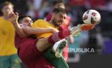 Pemain Indonesia Rafael William Struick berebut bola dengan pemain Australia saat pertandingan sepak bola babak 16 besar Piala Asia antara Australia dan Indonesia di Stadion Jassim Bin Hamad di Doha, Qatar, Ahad (28/1/2024). Indonesia harus mengakui keunggulan Australia setelah kalah 0-4 di babak 16 besar Piala Asia. (FOTO : AP Photo/Aijaz Rahi)