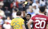 Pemain Australia Gethin Jones mendapat kartu kuning saat pertandingan sepak bola babak 16 besar Piala Asia antara Australia dan Indonesia di Stadion Jassim Bin Hamad di Doha, Qatar, Ahad (28/1/2024). Indonesia harus mengakui keunggulan Australia setelah kalah 0-4 di babak 16 besar Piala Asia. (FOTO : AP Photo/Hussein Sayed)
