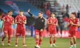Pesepak bola Timnas Indonesia Marc Klok (tengah) bersama rekannya melambaikan tangan ke suporter setelah kalah dari Timnas Australia seusai pertandingan babak 16 besar Piala Asia 2023 di Stadion Jassim Bin Hamad, Doha, Qatar, Ahad (28/1/2024). Indonesia kalah dari Australia dengan skor 0-4. (FOTO : ANTARAFOTO/Yusran Uccang)
