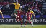 Pemain Indonesia Elkan Baggot melakukan duel udara dengan pemain Australia saat pertandingan sepak bola babak 16 besar Piala Asia antara Australia dan Indonesia di Stadion Jassim Bin Hamad di Doha, Qatar, Ahad (28/1/2024). Indonesia harus mengakui keunggulan Australia setelah kalah 0-4 di babak 16 besar Piala Asia. (FOTO : AP Photo/Aijaz Rahi)