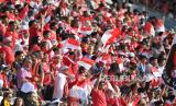 Sejumlah suporter Indonesia meneriakan yel-yel saat memberi dukungan kepada Timnas Indonesia yang bertanding melawan Timnas Australia pada babak 16 besar Piala Asia 2023 di Stadion Jassim Bin Hamad, Doha, Qatar, Ahad (28/1/2024). Indonesia kalah dari Australia dengan skor 0-4. (FOTO : ANTARAFOTO/Yusran Uccang)