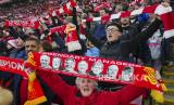 Penggemar Liverpool bernyanyi dan mengangkat syal sebelum pertandingan sepak bola putaran keempat Piala FA Inggris antara Liverpool dan Norwich, di stadion Anfield di Liverpool, Inggris, Ahad, (28/1/2024). (FOTO : AP)