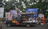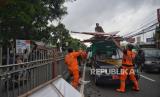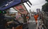 Petugas Satpol PP menertibkan alat peraga kampanye (APK) yang berada di pembatas jalan di Jalan Raya Bogor, Kramat Jati, Jakarta, Senin (29/1/2023). Petugas Satpol PP bersama unsur terkait lainnya menertibkan APK yang melanggar ketentuan yang bertujuan untuk menjaga kebersihan dan estetika kota. (FOTO : Republika/Prayogi)