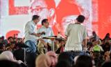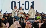 Capres dan cawapres nomor urut 1 Anies Baswedan dan Muhaimin Iskandar menjawab pertanyaan warga dalam acara Desak dan Slepet AMIN di JIExpo Kemayoran, Jakarta, Senin (30/1/2024).  Desak dan Slepet AMIN kali ini berdialog dengan kaum buruh dan para pengemudi ojek online. Pada kesempatan yang sama, musisi legendaris Rhoma Irama turut hadir sekaligus mendeklarasikan dukungannya untuk pasangan capres dan cawapres Anies Baswedan Muhaimin Iskandar pada Pemilu 2024. (FOTO : Republika/Thoudy Badai)