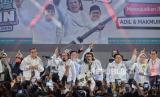 Capres dan cawapres nomor urut 1 Anies Baswedan dan Muhaimin Iskandar bersama musisi legendaris Rhoma Irama bernyanyi bersama saat acara acara Deklarasi dukungan terhadap AMIN di JIExpo Kemayoran, Jakarta, Senin (30/1/2024).  Desak dan Slepet AMIN kali ini berdialog dengan kaum buruh dan para pengemudi ojek online. Pada kesempatan yang sama, musisi legendaris Rhoma Irama turut hadir sekaligus mendeklarasikan dukungannya untuk pasangan capres dan cawapres Anies Baswedan Muhaimin Iskandar pada Pemilu 2024. (FOTO : Republika/Thoudy Badai)