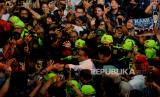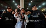 Capres nomor urut 1 Anies Baswedan menyapa warga dalam acara Desak dan Slepet AMIN di JIExpo Kemayoran, Jakarta, Senin (30/1/2024).  Desak dan Slepet AMIN kali ini berdialog dengan kaum buruh dan para pengemudi ojek online. Pada kesempatan yang sama, musisi legendaris Rhoma Irama turut hadir sekaligus mendeklarasikan dukungannya untuk pasangan capres dan cawapres Anies Baswedan Muhaimin Iskandar pada Pemilu 2024. (FOTO : Republika/Thoudy Badai)