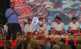 Ketua Umum Nderek Guru (Ndaru) Aditya Yusma (kiri) berbincang di hadapan relawan yang dihadiri Ulama Habib Muhammad Luthfi bin Ali bin Yahya yang juga sebagai Pembina Tim Kampanye Nasional (TKN) Prabowo-Gibran saat Istighotsah dan doa bersama di Dupan Square, Kota Pekalongan, Jawa Tengah, Senin (29/1/2024). Istighotsah dan doa bersama dengan relawan santri Prabowo-Gibran itu sebagai upaya, ikhtiar dan memperkuat semangat untuk meraih kemenangan pilihan presiden dan wakil presiden dalam Pemilu 2024. (FOTO : ANTARA FOTO/Harviyan Perdana Putra)