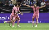 David Ruiz (tengah) dari Inter Miami merayakan bersama rekan setimnya Lionel Messi (Kiri) dan Jordi Alba (kanan) setelah mencetak gol pada pertandingan Riyadh Season Cup 2024 antara Al Hilal dan Inter Miami di Riyadh, Arab Saudi, Selasa (30/1/2024) dini hari WIB. (FOTO : EPA)
