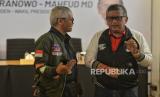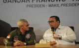 Sekretaris TPN Ganjar-Mahfud Hasto Kristiyanto berbincang bersama Ketua Tim Penjadwalan TPN Ganjar-Mahfud Aria Bima sebelum memberikan keterangan terkait persiapan kampanye akbar pasalon Ganjar-Mahfud di Media Lounge TPN, Jakarta, Selasa (30/1/2024). Pasangan Ganjar Pranowo - Mahfud Md akan menggelar kampanye akbar dalam bentuk konser Salam Metal di Stadion Utama Gelora Bung Karno (SUGBK) pada Sabtu (3/2/2024). Konser Salam Metal digagas atas buah hasil keinginan atau kehendak rakyat. Hal ini selaras dengan tema dari kampanye akbar pasangan calon nomor urut tiga, Ganjar-Mahfud yaitu Hajatan Rakyat. (FOTO : Republika/Prayogi)