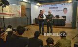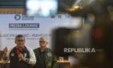 Sekretaris TPN Ganjar-Mahfud Hasto Kristiyanto didampingi Ketua Tim Penjadwalan TPN Ganjar-Mahfud Aria Bima memberikan keterangan terkait persiapan kampanye akbar pasalon Ganjar-Mahfud di Media Lounge TPN, Jakarta, Selasa (30/1/2024). Pasangan Ganjar Pranowo - Mahfud Md akan menggelar kampanye akbar dalam bentuk konser Salam Metal di Stadion Utama Gelora Bung Karno (SUGBK) pada Sabtu (3/2/2024). Konser Salam Metal digagas atas buah hasil keinginan atau kehendak rakyat. Hal ini selaras dengan tema dari kampanye akbar pasangan calon nomor urut tiga, Ganjar-Mahfud yaitu Hajatan Rakyat. (FOTO : Republika/Prayogi)