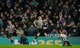 Fabian Schaer dari Newcastle mencetak gol selama pertandingan sepak bola Liga Premier Inggris antara Aston Villa FC dan Newcastle United, di Birmingham, Inggris, Rabu (31/1/2024) dini hari WIB. (FOTO : EPA)