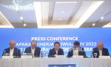 Direktur Retail Banking BSI Ngatari, Direktur Risk Management BSI Grandhis H. Harumansyah, Direktur Utama BSI Hery Gunardi, Wakil Direktur Utama BSI Bob T. Ananta, Direktur Finance & Strategy BSI Ade Cahyo Nugroho (dari kiri) saat pemaparan kinerja triwulan IV 2023 di The Tower Jakarta, Kamis (1/2/2024). (FOTO : Dok.Republika)