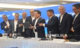 Direktur Utama BSI Hery Gunardi, Wakil Direktur Utama BSI Bob T. Ananta, Direktur Finance & Strategy BSI Ade Cahyo Nugroho, Direktur Sales & Distribution BSI Anton Sukarna, Direktur Wholesale Transaction Banking BSI Zaidan Novari, dan Direktur Compliance & Human Capital BSI Tribuana Tunggadewi (dari kiri) saat pemaparan kinerja triwulan IV 2023 di The Tower Jakarta, Kamis (1/2/2024). (FOTO : Dok.Republika)