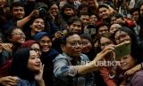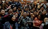Menko Polhukam Mahfud MD berswafoto bersama jurnalis usai memberikan keterangan pers terkait pengunduran dirinya sebagai menteri di Kemenko Polhukam, Jakarta, Kamis (1/2/2024). Menteri Koordinator Bidang Politik, Hukum dan Keamanan (Menkopolhukam) Mahfud MD resmi mengundurkan diri sebagai Menteri di Kabinet Indonesia Maju (KIM) usai menyerahkan surat permohonan pengunduran diri kepada Presiden Joko Widodo di Istana Negara, Kamis (1/2) sore. Usai konferensi pers, Mahfud pamitan kepada wartawan dan selfie dengan semua wartawan yang meliput di Kemenko Polhukam. (FOTO : Republika/Thoudy Badai)