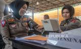 Petugas kesehatan Polri mengukur tekanan darah rekannya pada pemeriksaan kesehatan personel pengamanan Tempat Pemungutan Suara (TPS) di Klinik Biddokkes Polda Sulteng di Palu, Sulawesi Tengah, Kamis (1/2/2024). Polda Sulteng menurunkan 3.935 personel dalam pengamanan TPS di wilayah Sulteng, dan sebelum diterjunkan ke lapangan, selain diberikan bimbingan psikologi, juga dilakukan pemeriksaan kesehatan untuk menjamin kelancaran pelaksanaan tugas. (FOTO : ANTARA FOTO/Basri Marzuki)