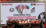 Ketua Program Rumah Aspirasi Ralawan Ganjar-Mahfud, Erwin Usman didampingi oleh sejumlah perwakilan relawan menggelar konfrensi pers Konser Metal, 3 Menang Total di kantor Tim Kordinasi Relawan Pemenangan Pilpres Ganjar Pranowo-Mahfud MD (TKRPP), Jakarta, Kamis (1/2/2024). Konfrensi pers digelar terkait penyelenggaraan Konser Salam Metal 3 Menang Total di Stadion Utama Gelora Bung Karno pada 3 Febuari 2024 mendatang dalam memenangkan Ganjar Pranowo - Mahfud MD di Pilpres 2024. Dalam kesempatan tersebut perwakilan relawan memaparkan sejumlah bantuan yang bersifat swadaya untuk kebutuhan para warga yang akan mengikuti hajatan rakyat dan di hibur oleh Slank serta sejumlah artis ibukota. (FOTO : Dok Republika)