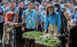 REPUBLIKA.CO.ID, DEPOK -- Calon wakil presiden nomor urut 2 Gibran Rakabuming Raka dan istrinya Selvi Ananda berdialog dengan pedagang saat blusukan di Pasar Kemiri Muka, Depok, Jawa Barat, Jumat (2/2/2024). Dalam kesempatan itu, Gibran menyerap aspirasi dan keluhan pedagang hingga berbelanja sayur mayur.