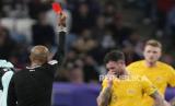 Pemain Australia Graig Goodwin mendapatkan kartu merah pada pertandingan sepak bola perempat final Piala Asia melawan Korea Selatan di Stadion Al Janoub di Al Wakrah, Qatar, Jumat (2/2/2024). Korea Selatan menang dramatis atas Australia dengan skor 2-1. (FOTO : AP Photo/Thanassis Stavrakis)