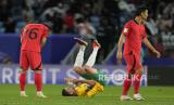 Ekspresi pemain Australia setelah dikalahkan Korea Selatan pada pertandingan sepak bola perempat final Piala Asia di Stadion Al Janoub di Al Wakrah, Qatar, Jumat (2/2/2024). Korea Selatan menang dramatis atas Australia dengan skor 2-1. (FOTO : AP Photo/Aijaz Rahi)
