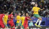 Pemain Australia Jackson Irvine melakukan sundulan pada pertandingan sepak bola perempat final Piala Asia melawan Korea Selatan di Stadion Al Janoub di Al Wakrah, Qatar, Jumat (2/2/2024). Korea Selatan menang dramatis atas Australia dengan skor 2-1. (FOTO : AP Photo/Aijaz Rahi)