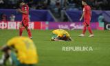 Ekspresi pemain Australia setelah dikalahkan Korea Selatan pada pertandingan sepak bola perempat final Piala Asia di Stadion Al Janoub di Al Wakrah, Qatar, Jumat (2/2/2024). Korea Selatan menang dramatis atas Australia dengan skor 2-1. (FOTO : AP Photo/Thanassis Stavrakis)