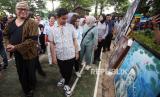 Calon wakil presiden nomor urut 2 Gibran Rakabuming Raka (kanan) bersama seniman Dik Doank (kiri) melihat seni lukis saat menggelar kampanye tatap muka dengan sejumlah seniman, budayawan dan komunitas di Kandank Jurank Doank Ciputat, Tangerang Selatan, Banten, Sabtu (3/2/2024). Dalam kampanyenya Gibran menjanjikan karya seni dari seorang seniman dapat dijadikan jaminan untuk mendapatkan dana permodalan dari bank. (FOTO : ANTARA FOTO/Muhammad Iqbal)