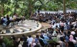 Calon wakil presiden nomor urut 2 Gibran Rakabuming Raka (kelima kiri) bersama seniman Dik Doank (keenam kiri) berdialog dengan sejumlah seniman, budayawan dan komunitas di Kandank Jurank Doank Ciputat, Tangerang Selatan, Banten, Sabtu (3/2/2024). Dalam kampanyenya Gibran menjanjikan karya seni dari seorang seniman dapat dijadikan jaminan untuk mendapatkan dana permodalan dari bank. (FOTO : ANTARA FOTO/Muhammad Iqbal)