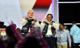 Capres-cawapres nomor urut 3 Ganjar Pranowo (kiri) dan Mahfud MD tiba di lokasi Debat Kelima Pilpres 2024 di Balai Sidang Jakarta Convention Center (JCC), Senayan, Jakarta, Ahad (4/2/2024). Debat tersebut bertemakan kesejahteraan sosial, kebudayaan, pendidikan, teknologi informasi, kesehatan, ketenagakerjaan, sumber daya manusia, dan inklusi. (FOTO : Republika/Thoudy Badai)