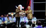 Perwakilan panelis Imam Prasodjo (kanan) memberikan daftar pertanyaan kepada Ketua Komisi Pemilihan Umum (KPU) Hasyim Asy ari dalam debat kelima Pilpres 2024 di Balai Sidang Jakarta Convention Center (JCC) Senayan, Jakarta, Ahad (4/2/2024). Debat kali ini bertemakan kesejahteraan sosial, kebudayaan, pendidikan, teknologi informasi, kesehatan, ketenagakerjaan, sumber daya manusia, dan inklusi. (FOTO : Thoudy Badai/Republika)