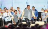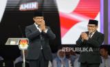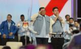 Pasangan calon presiden dan calon wakil presiden nomor urut 2 Prabowo Subianto (kiri) dan Gibran Rakabuming Raka (kanan) tiba di lokasi Debat Kelima Pilpres 2024 di Jakarta Convention Center (JCC), Senayan, Jakarta, Ahad (4/2/2024). Debat Kelima Pilpres 2024 yang diikuti tiga pasangan capres-cawapres tersebut bertema kesejahteraan sosial, kebudayaan, pendidikan, teknologi informasi, kesehatan, ketenagakerjaan, sumber daya manusia, dan inklusi. (FOTO : Republika/Thoudy Badai)