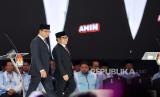 Capres-cawapres nomor urut 1 Anies Baswedan (kiri) dan Muhaimin Iskandar tiba di lokasi Debat Kelima Pilpres 2024 di Balai Sidang Jakarta Convention Center (JCC), Senayan, Jakarta, Ahad (4/2/2024). Debat tersebut bertemakan kesejahteraan sosial, kebudayaan, pendidikan, teknologi informasi, kesehatan, ketenagakerjaan, sumber daya manusia, dan inklusi. (FOTO : Republika/Thoudy Badai)