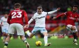 Jarrod Bowen dari West Ham beraksi saat pertandingan Liga Premier Inggris antara Manchester United dan West Ham United di Manchester, Inggris, Ahad (4/2/2024). (FOTO : EPA-EFE/ADAM VAUGHAN)