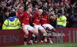 Rasmus Hojlund dari Manchester United (kiri), Alejandro Garnacho dari Manchester United (tengah) dan Kobbie Mainoo dari Manchester United (kanan) merayakan gol 2-0 pada pertandingan Liga Utama Inggris antara Manchester United dan West Ham United di Manchester, Inggris, Ahad (4/2/2024). (FOTO : EPA-EFE/ADAM VAUGHAN )