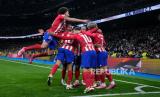 Pemain tim Atletico Madrid melakukan selebrasi setelah Marcos Llorente mencetak gol pada pertandingan sepak bola La Liga Spanyol antara Real Madrid dan Atletico Madrid di stadion Santiago Bernabeu di Madrid, Spanyol, Ahad (5/2/2024) WIB. Real Madrid bermain imbang 1-1 dengan Atletico Madrid. (FOTO : AP Photo/Bernat Armangue)