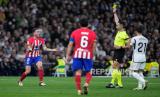 Pemain Atletico Madrid Saul (kiri) mendapatkan kartu kuning pada pertandingan sepak bola La Liga Spanyol antara Real Madrid dan Atletico Madrid di Stadion Santiago Bernabeu di Madrid, Spanyol, Ahad (5/2/2024) WIB. Real Madrid bermain imbang 1-1 dengan Atletico Madrid. (FOTO : AP Photo/Bernat Armangue)