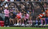 Lionel Messi dari Inter Miami (tengah) terlihat dari bangku cadangan selama pertandingan sepak bola persahabatan antara Tim Hong Kong dan Inter Miami CF AS di Stadion Hong Kong di Hong Kong, Ahad, (4/2/2024). (FOTO : AP)