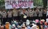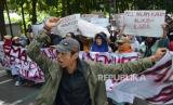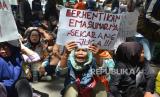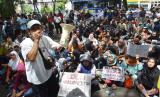 Ratusan pedagang kaki lima (PKL) yang tergabung dalam Aliansi PKL Kota Bandung Melawan menggelar aksi di depan Kantor Wali Kota Bandung, Jalan Wastukancana, Rabu (7/2/2024). Menurut mereka, kebijakan mengenai zonasi (kawasan PKL) yang dibuat Pemkot Bandung tidak memberikan solusi yang tepat untuk PKL. Dalam aksi itu mereka menyampaikan sejumlah tuntutan, di antaranya menolak penggusuran secara sepihak terhadap PKL, memberikan diskresi kepada PKL mengenai hak pedagang, dan hentikan tindak represifitas dari aparat. (FOTO : Edi Yusuf/Republika)