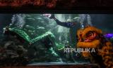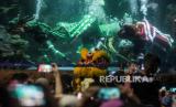 Penyelam mengenakan kostum naga beraksi dalam pertunjukan bertajuk Ancol Lunar Festival di Sea World Ancol Taman Impian, Jakarta Utara, Kamis (8/2/2024). Sea World Ancol yang menampilkan berbagai macam koleksi ikan tersebut menjadi salah satu destinasi wisata edukatif favorit yang dikunjungi warga. Pada musim libur panjang atau long weekend pada 8-11 Februari 2024, pengunjung juga dapat menyaksikan atraksi barongsai dalam air yang digelar untuk menyambut Tahun Baru Imlek 2575 Kongzili. (FOTO : Republika/Putra M. Akbar)