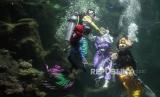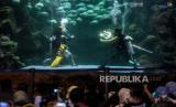 Penyelam mengenakan kostum saat tampil dalam pertunjukan bertajuk Ancol Lunar Festival di Sea World Ancol Taman Impian, Jakarta Utara, Kamis (8/2/2024). Sea World Ancol yang menampilkan berbagai macam koleksi ikan tersebut menjadi salah satu destinasi wisata edukatif favorit yang dikunjungi warga. Pada musim libur panjang atau long weekend pada 8-11 Februari 2024, pengunjung juga dapat menyaksikan atraksi barongsai dalam air yang digelar untuk menyambut Tahun Baru Imlek 2575 Kongzili. (FOTO : Republika/Putra M. Akbar)