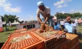 Pekerja mengeluarkan ayam dari kotak penyimpanan saat pembagian telur dan ayam gratis di Desa Deyeng, Kediri, Jawa Timur, Kamis (8/2/2024). Pembagian 6 ton telur dan 2 ribu ekor ayam oleh komunitas peternak ayam petelur tradisional dan supplier dari Kediri dan Blitar tersebut guna menggalang dukungan untuk kemenangan calon presiden nomor urut 2 Prabowo-Gibran pada Pemilu 2024 sekaligus menyalurkan aspirasi terkait solusi rendahnya harga jual telur dan daging ayam. (FOTO : ANTARA FOTO/Prasetia Fauzani)