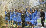 Pemain Al Hilal memegang trofi saat upacara podium usai menjuarai final Riyadh Season Cup 2024 antara Al Hilal dan Al Nassr di Riyadh, Arab Saudi, Jumat (9/2/2024) dini hari WIB. (FOTO : EPA)