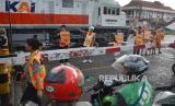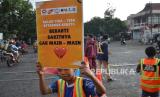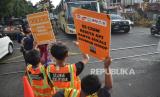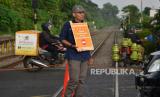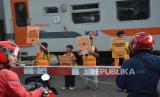 Relawan perlintasan dari komunitas Pecinta kereta Api, Edan Sepur melakukan sosialisasi disiplin perlintasan kereta api, di Jalan Laswi, Kota Bandung, Jawa Barat, Jumat (9/2/2024). Dengan kegiatan tersebut diharapkan bisa menyadarkan masyarakat akan keselamatan berkendara khususnya saat melewati perlintasan kereta api. (FOTO : Edi Yusuf/Republika)