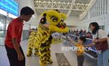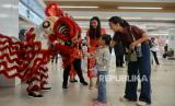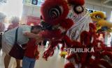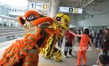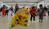 Aksi Barongsai meriahkan imlek di stasiun keberangkatan dan kedatangan.