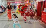 Atraksi barongsay menghibur penumpang di Stasiun Kereta Cepat Halim, Jakarta, Sabtu (10/2/2024). PT KCIC menggelar pertunjukan barongsay untuk menghibur penumpang yang akan menaiki dan turun dari Kereta Cepat Halim juga membagikan jeruk kepada calon penumpang dalam rangka memeriahkan Tahun Baru Imlek 2574. (FOTO : Republika/Thoudy Badai)