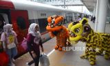 Atraksi Barongsai menghibur penumpang kereta cepat atau woosh yang baru datang, di Stasiun Kereta Cepat Padalarang, Kabupaten Bandung, Sabtu (10/2/2024). PT KCIC menggelar antraksi batongsai di stasiun dalam rangka memeriahkan Tahun Baru Imlek 2574. (FOTO : Edi Yusuf/Republika)