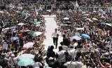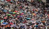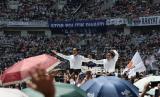 Simpatisan berteduh menggunakan payung saat menghadiri kampanye akbar Calon Presiden dan Calon Wakil Presiden nomor urut 1 Anies Baswedan dan Muhaimin Iskandar di Jakarta International Stadium, Jakarta, Sabtu (10/2/2024). Kampanye akbar bertajuk Bersatu, Berani, Berubah yang merupakan rangkaian kampanye terakhir sebelum masa tenang Pilpres 2024 tersebut dihadiri oleh ratusan ribu simpatisan dari berbagai daerah. (FOTO : Republika/Putra M. Akbar)
