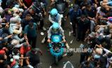 Cawpres nomor ururt 2 Gibran Rakabuming Raka didampingi istrinya Selvi Ananda mengendarai sepeda motor listrik tiba di kawasan Stadion Utama Gelora Bung Karno (SUGBK) saat gelaran kampanye akbar bertajuk Pesta Rakyat untuk Indonesia Maju di Jakarta, Sabtu (10/2/2024). (FOTO : Republika/Thoudy Badai)
