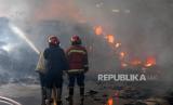 REPUBLIKA.CO.ID, SIDOARJO. -- Sejumlah petugas pemadam kebakaran berusaha memadamkan api yang membakar gudang karton di Buduran, Sidoarjo, Jawa Timur, Sabtu (10/2/2024).