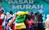 Warga memanggul beras yang dibeli pada Operasi pasar murah di Banyuwangi, Jawa Timur, Ahad (11/2/2024). Pasar murah yang menyediakan sembako seperti beras, minyak goreng, telur dan gula dengan harga di bawah harga pasar itu digelar oleh Dinas Perindustrian dan Perdagangan Pemprov Jawa Timur tersebut sebagai upaya stabilisasi harga kebutuhan pokok. (FOTO : ANTARA FOTO/Budi Candra Setya)