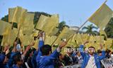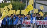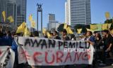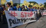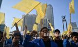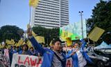Sejumlah mahasiswa yang tergabung dalam Pergerakan Mahasiswa Islam Indonesia (PMII) melakukan aksi di Kawasan Bundaran HI, Jakarta, Senin (12/2/2024). Dalam aksinya mereka menuntut pemerintah menghentikan praktik-praktik Kolusi, Korupsi da Nepotisme (KKN) serta meminta menjunjung tinggi Hak Asasi Manusia (HAM). (FOTO : Republika/Prayogi)